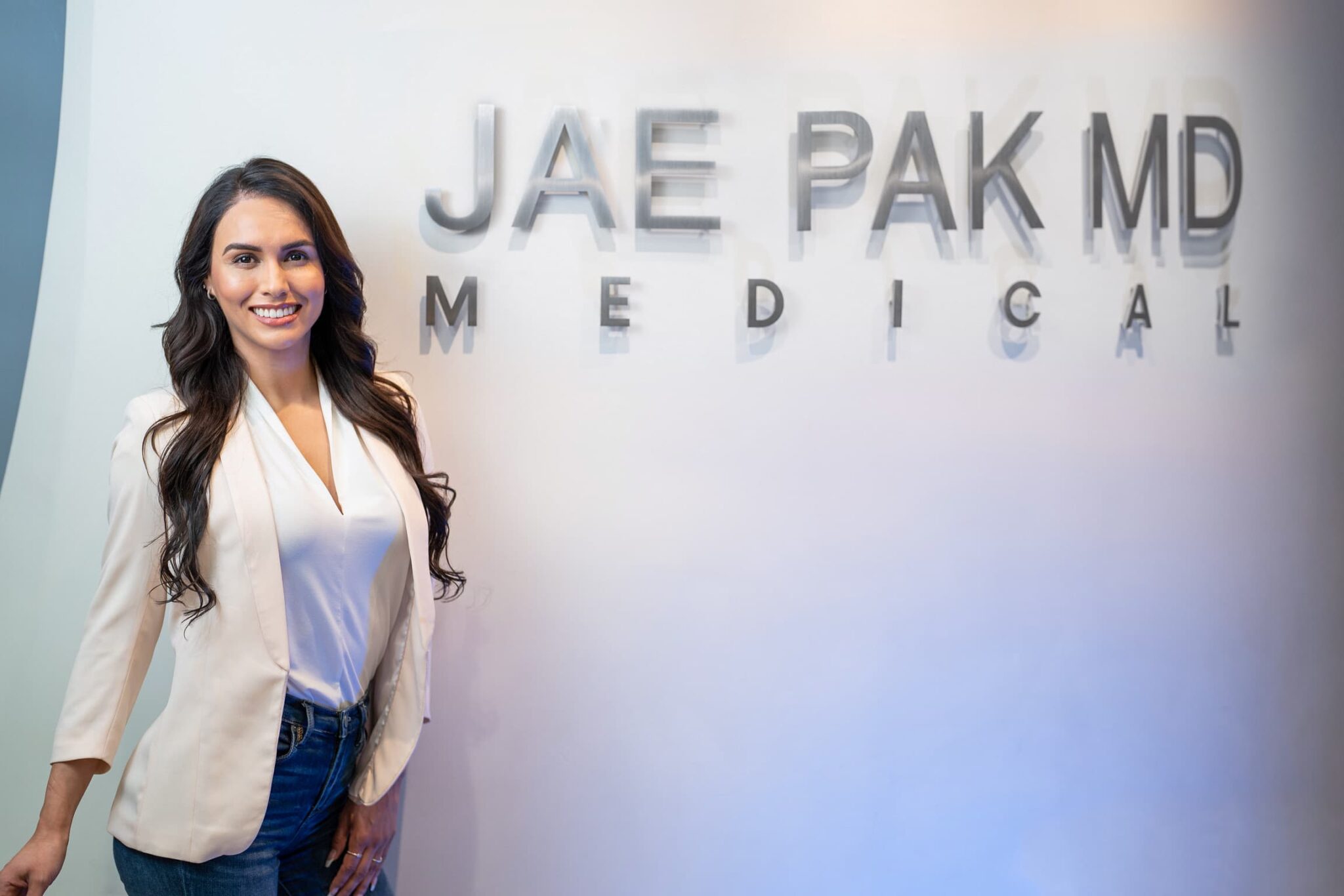 Actual Patient of Jae Pak, M.D. standing in front of our logo