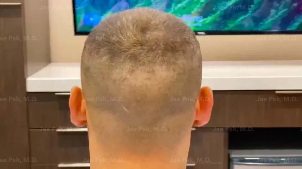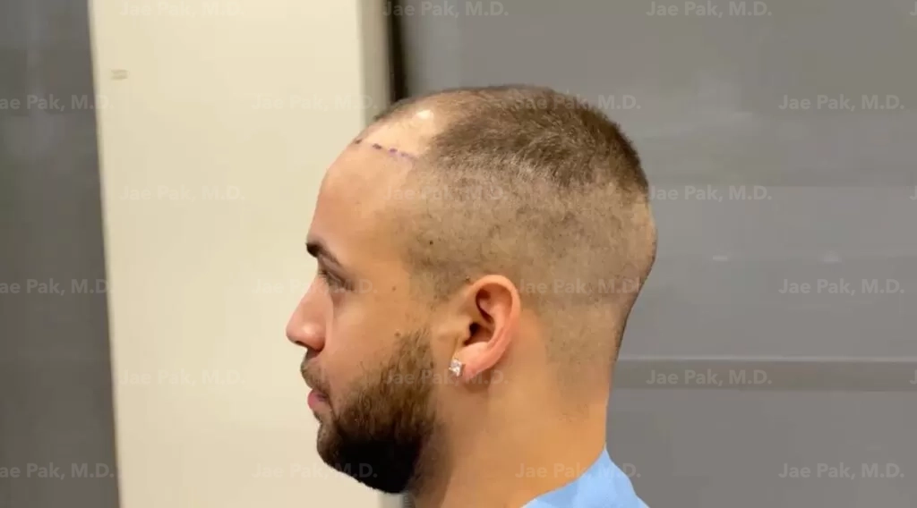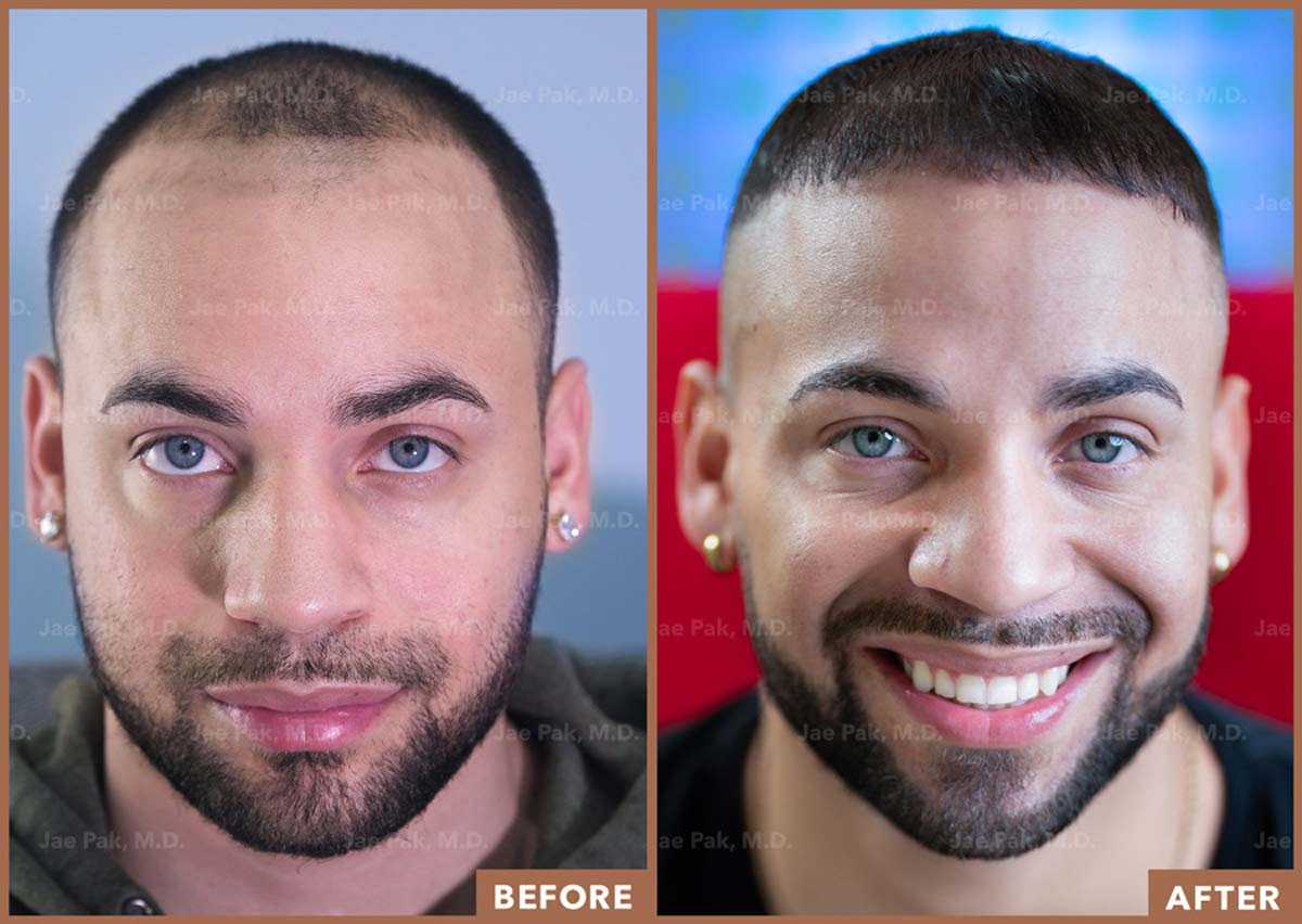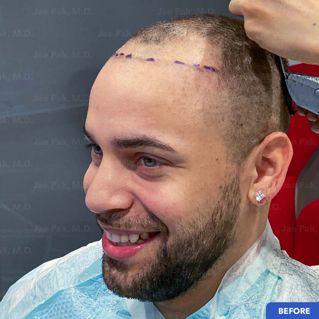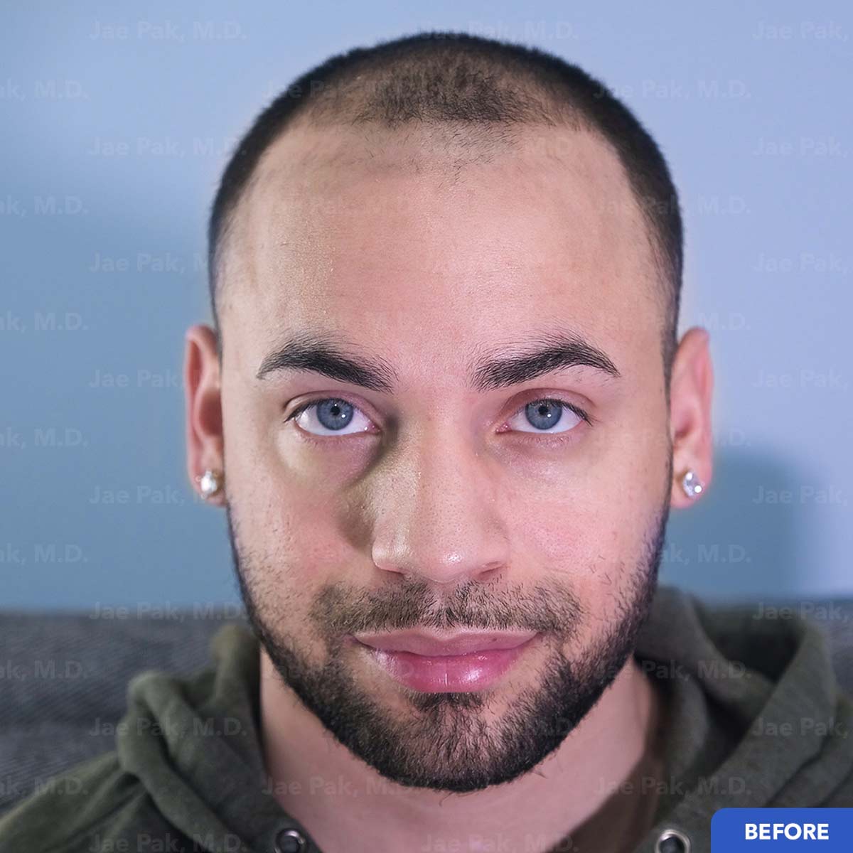 This patient of Jae Pak, M.D. started losing hair in his hairline and crown area at a young age. With Dr. Pak’s help, he was able to redefine his hairline. As time goes on more of the natural hairs will thin and an additional surgery can be performed to add more density to the balding areas.