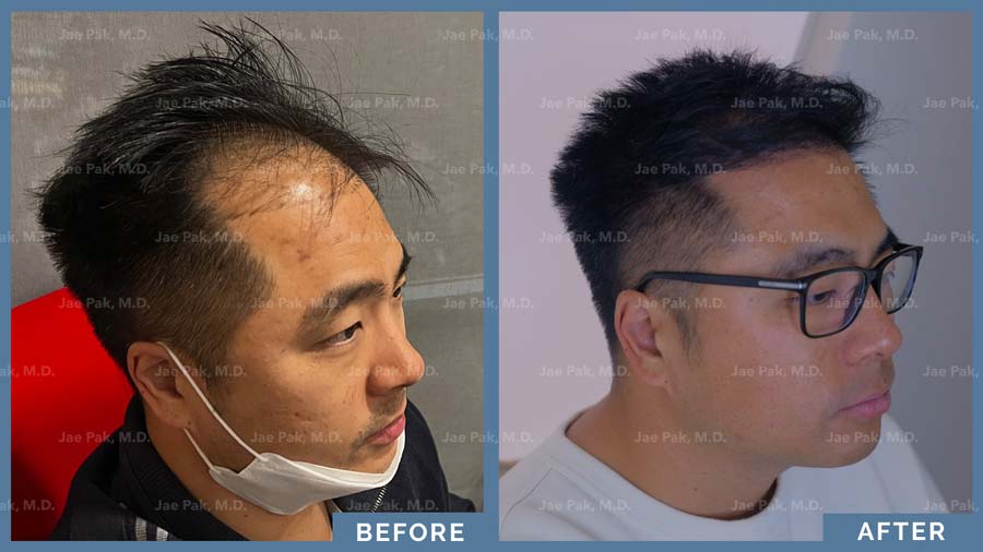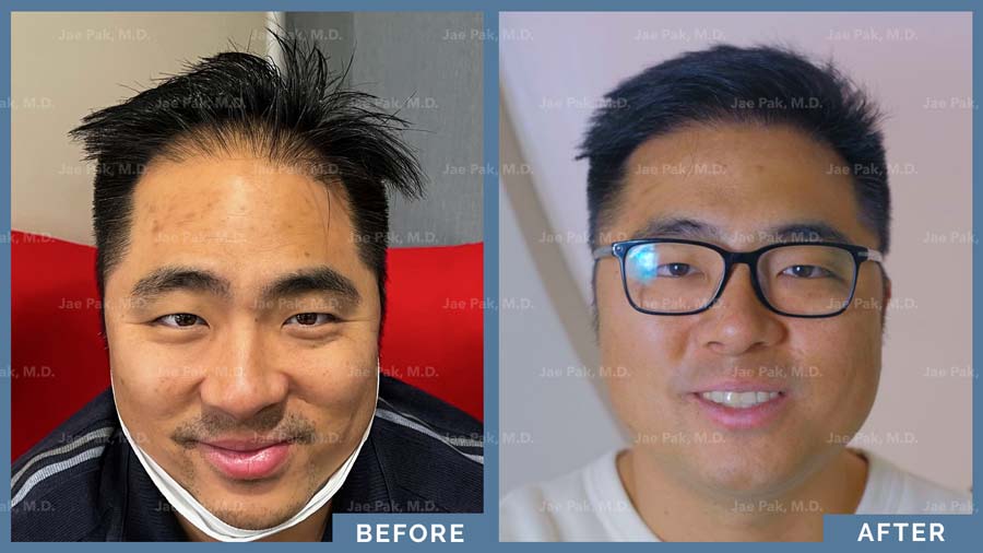 This is very common in men and an FUE or FUT hair transplant can restore the hairline and fill in the crown and look very natural. Dr. Pak takes your hair from the back of the scalp where the hair grafts are plentiful and transfers them to the hairline and crown.