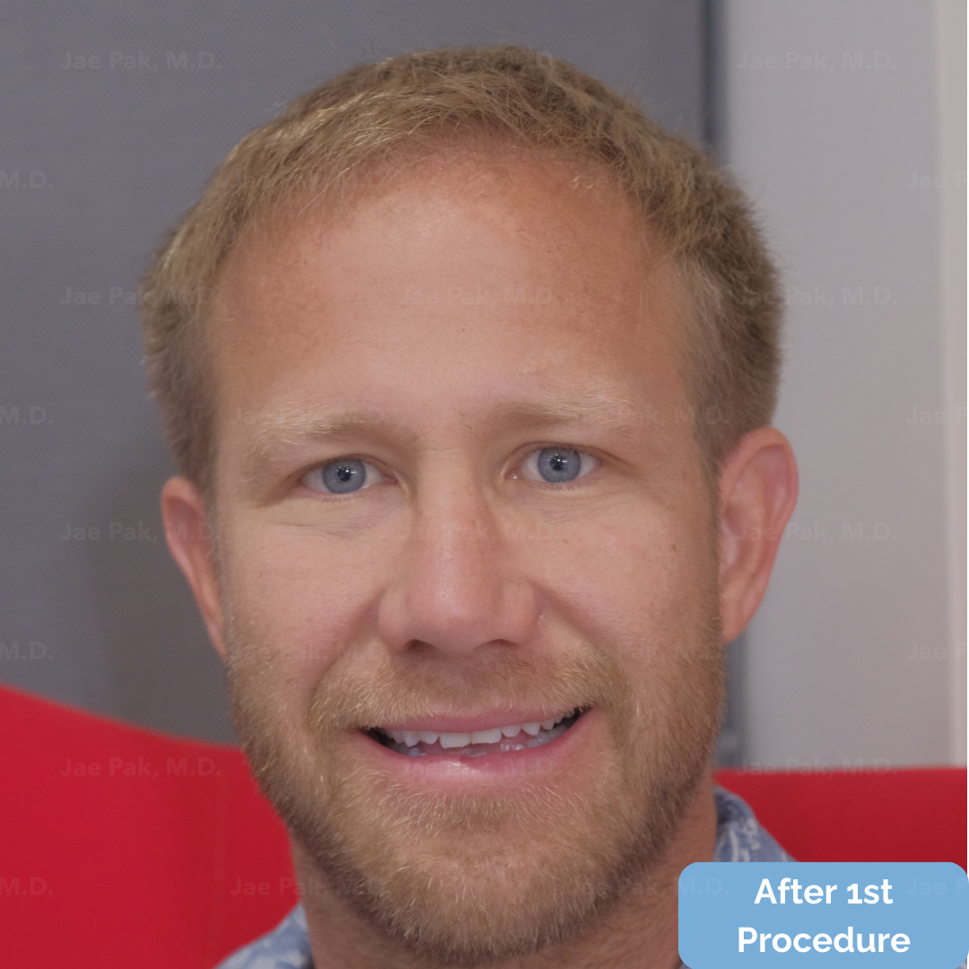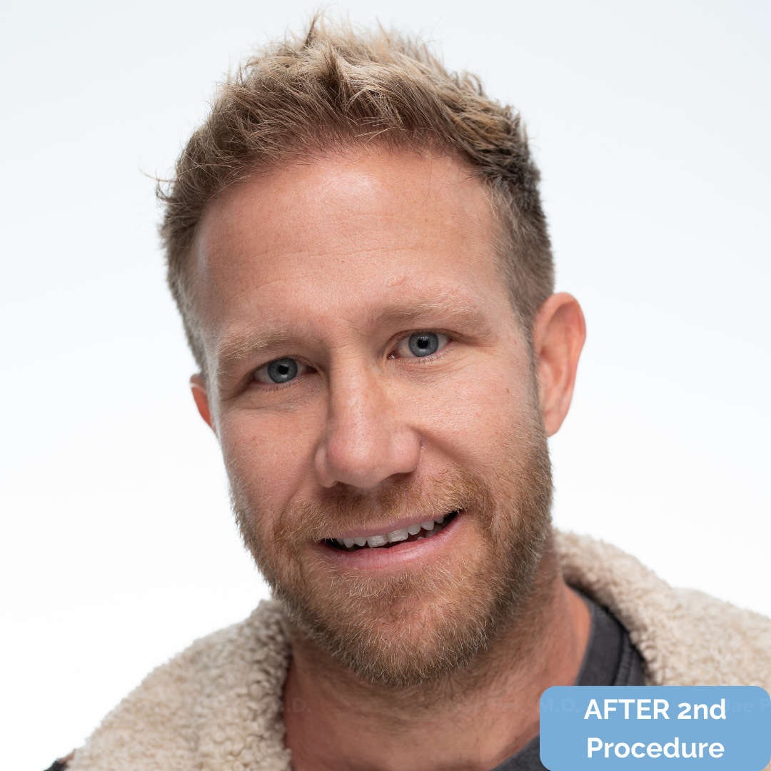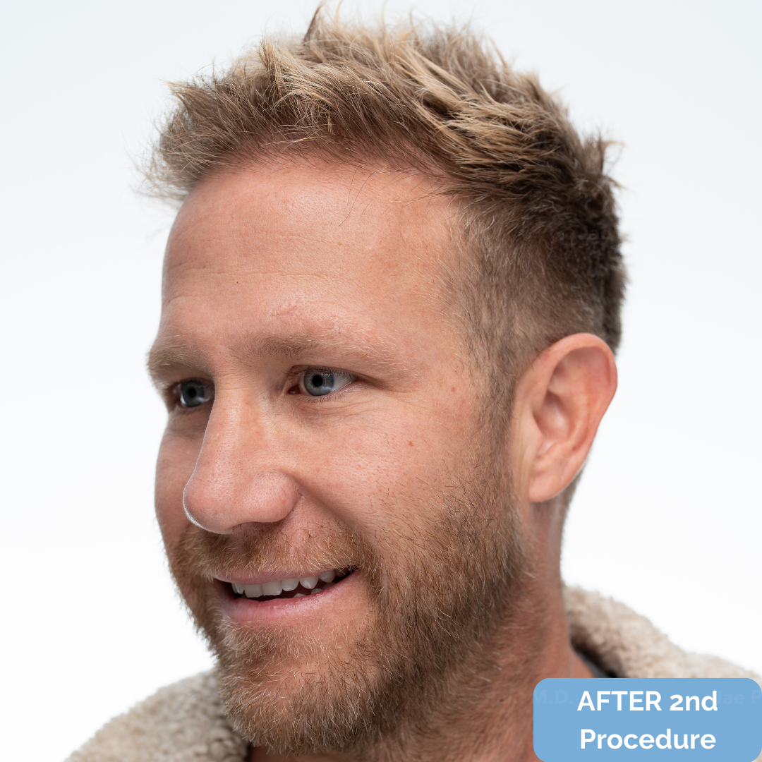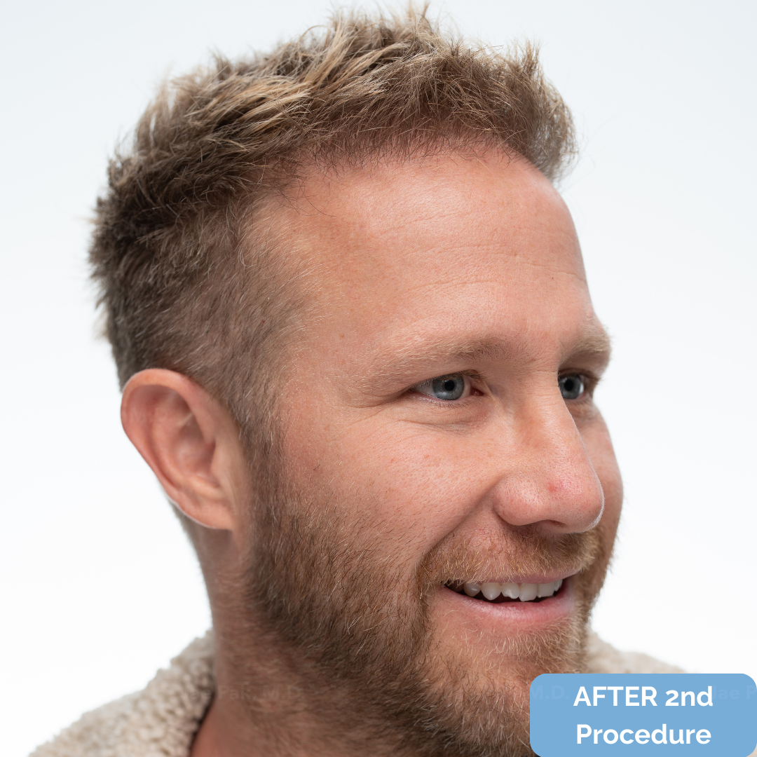For optimal results, depending on the texture of your hair, undergoing two hair transplant procedures may be recommended. This was the case for this patient as his hair is fine and he wanted a thicker look. The initial transplant is pivotal in establishing a natural hairline, while the 2nd procedure focuses on enhancing density and ensuring a fuller appearance without causing too much trauma to the natural hairs. While many patients find satisfaction with one procedure, it’s important to note that individual outcomes can vary based on factors such as hair characteristics and desired aesthetic goals.
