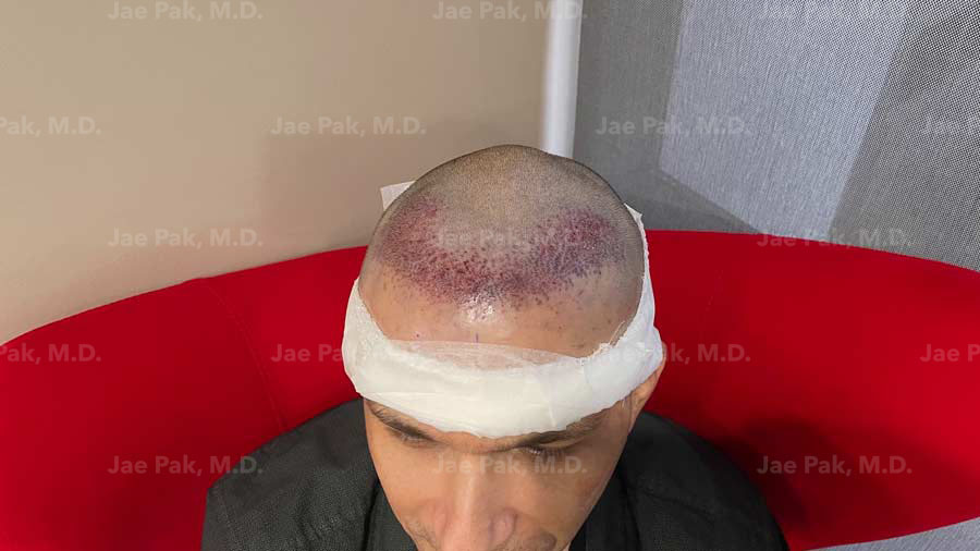 It is normal to experience some redness after a hair restoration procedure. The redness will go away in 3-14 days. The bandage is kept on for 24 hours after surgery to help prevent swelling.